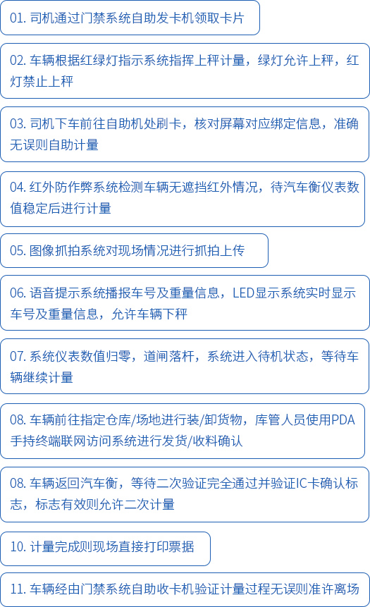 按功能性劃分,主要由以下幾個小系統組成:門禁系統,數字式電子汽車衡系統,自助終端智能處理系統,IC驗證系統,車號自動識別系統,圖像抓拍與視頻監控系統,LED顯示系統,紅外防作弊系統,紅綠燈指示系統,語音提示系統,PDA手持終端確認,小程序系統遠程管理等。